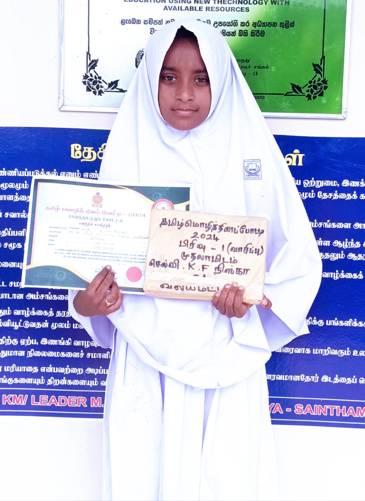 இம்முறை (2024) நடைபெற்ற வலய மட்டத்திலான தமிழ்மொழித்தினப் போட்டியில் சாய்ந்தமருது லீடர் அஸ்ரப் வித்தியாலய மாணவி கே.எப். நிஸ்கா முதலாம் பிரிவுக்குரிய வாசிப்புப் போட்டியில் கலந்து கொண்டு முதலாமிடத்தை பெற்று மாவட்ட மட்ட போட்டிக்கு தகுதி பெற்றுள்ளார்.